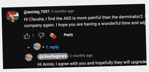 The funny thing is that the comments underneath her defamatory video all agree that the Derminator is superior to Dr. Pen in all respects. Power, pain etc.